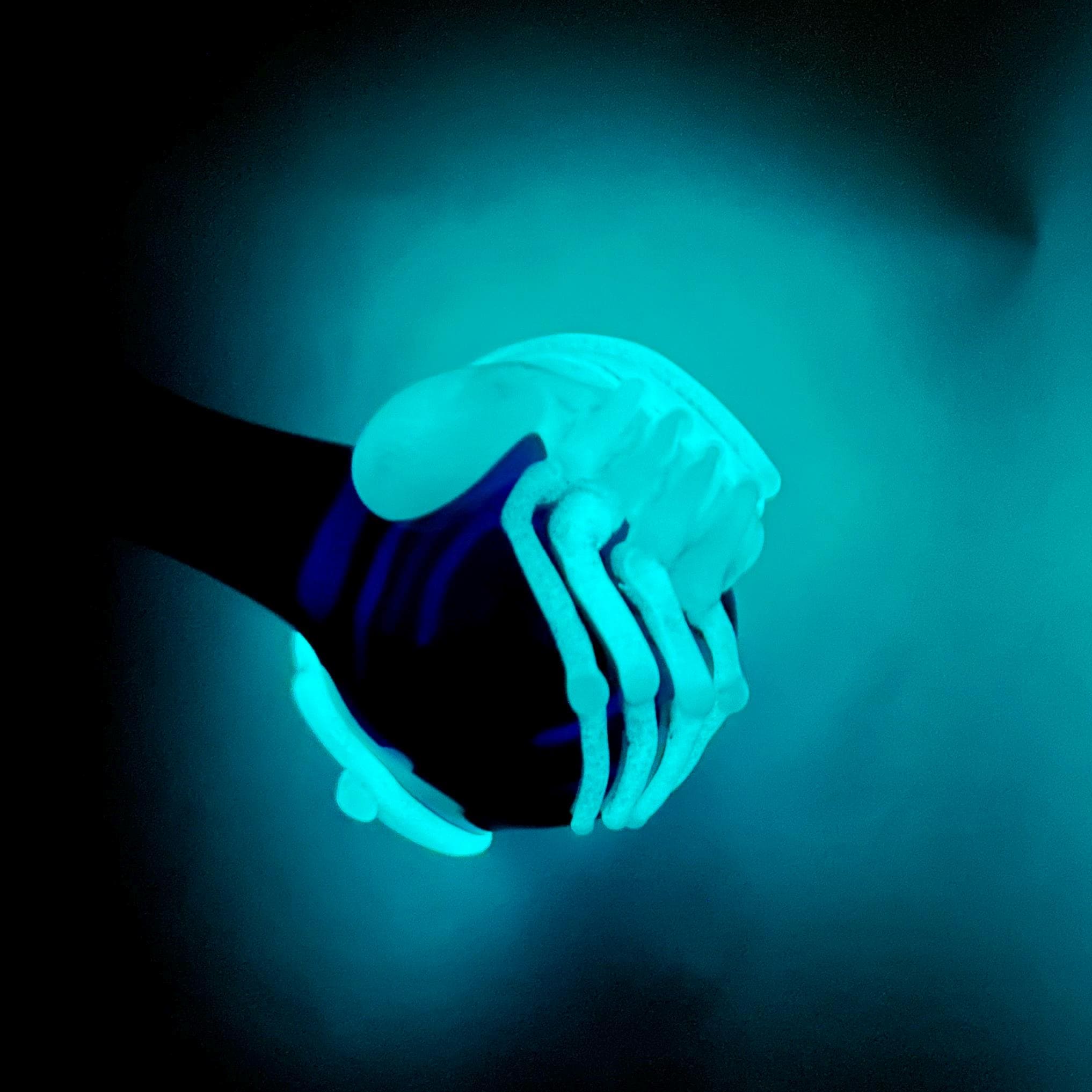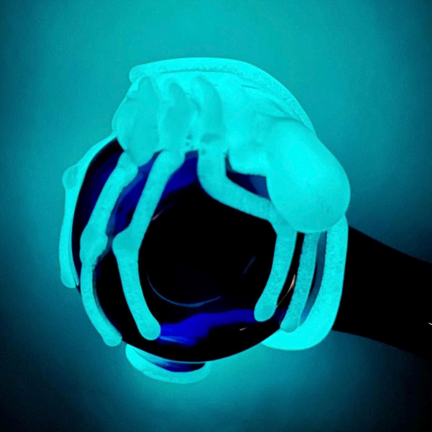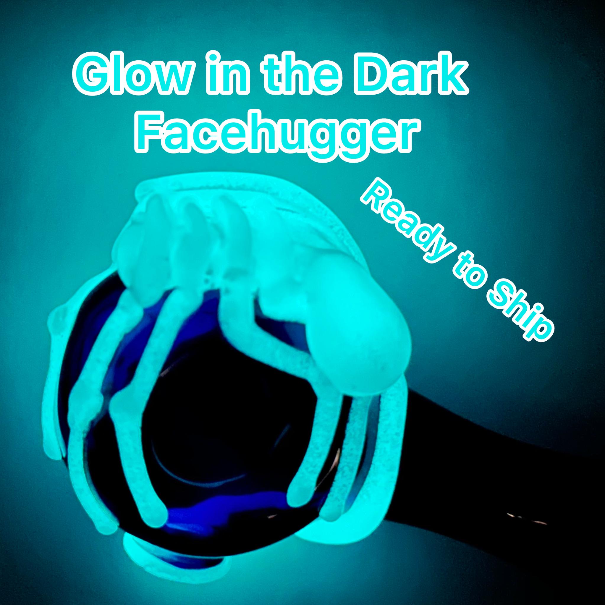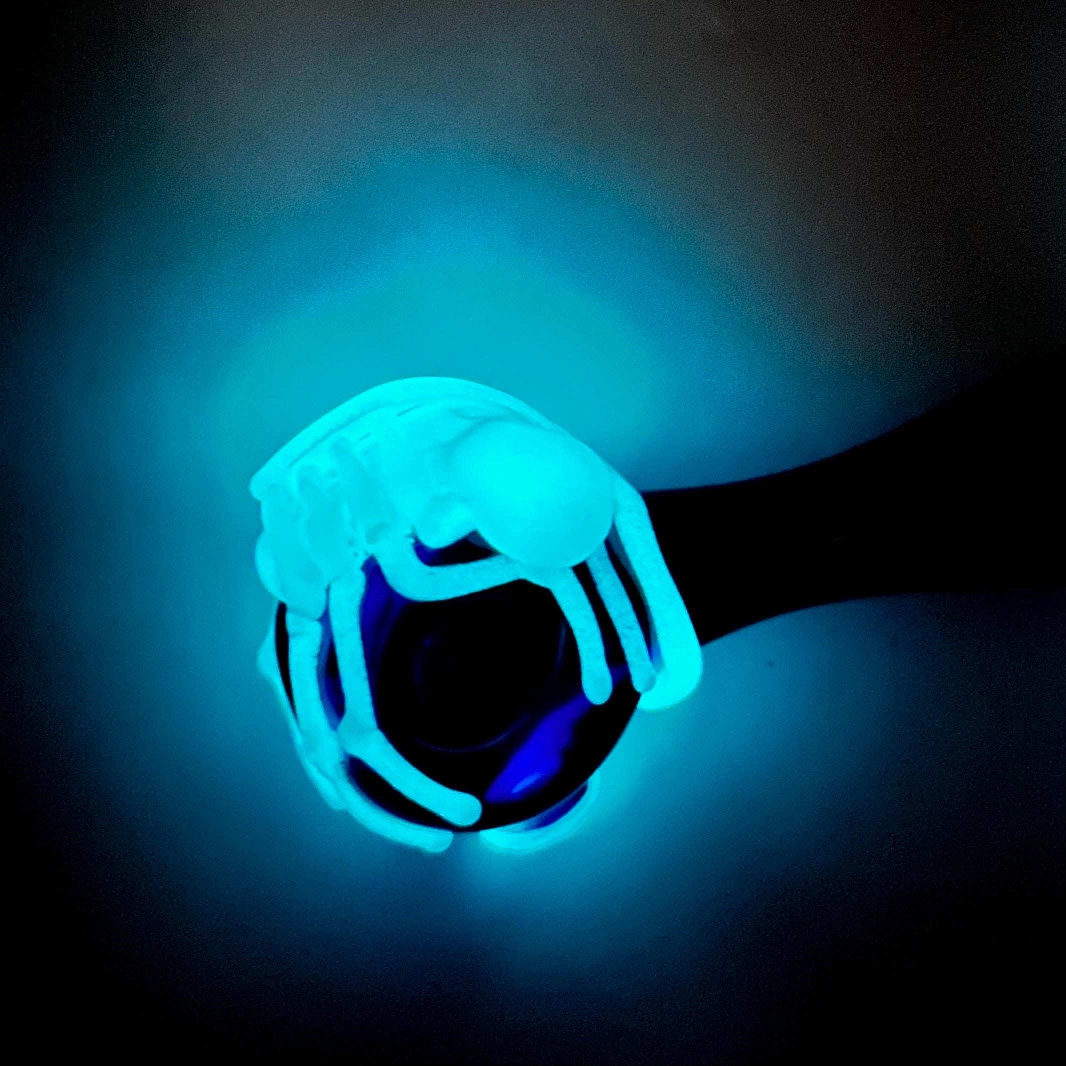 "Game Over Man, Game Over!" Beautifully crafted glass cobalt blue spoon pipe detailed with artistic flamework Aqua glow in the dark alien facehugger. Look skeleton white in the day but charge it with natural sunlight or lamp and it will glow at nighttime. Ready to Ship now.