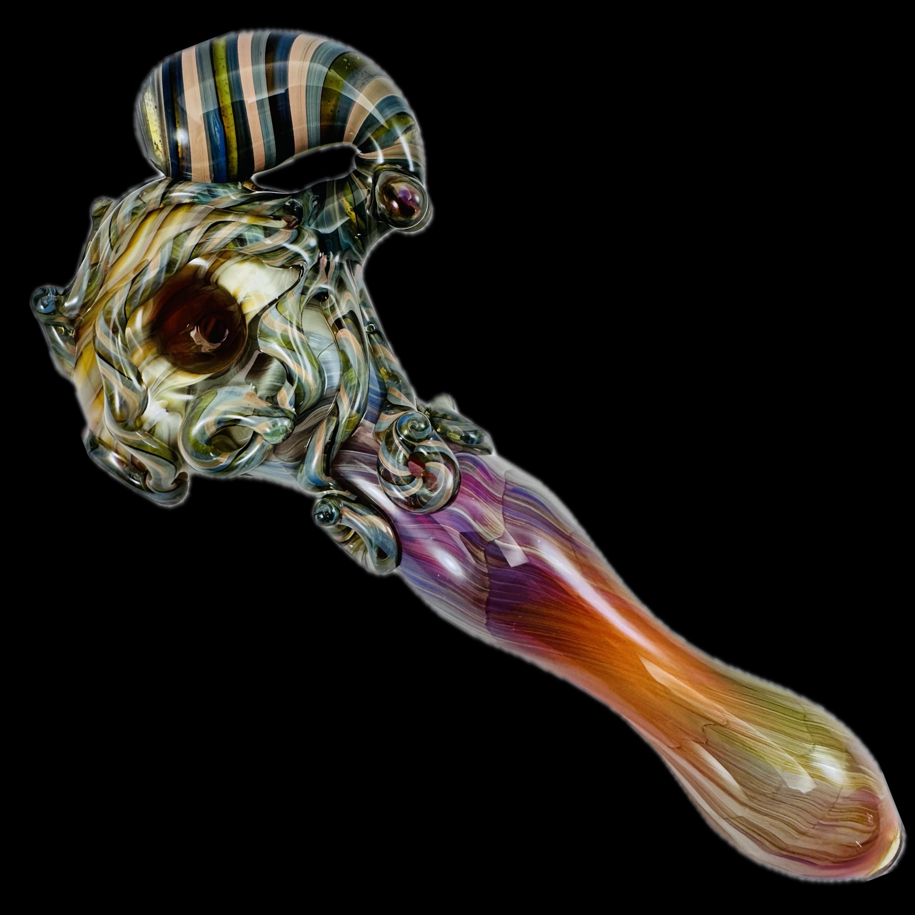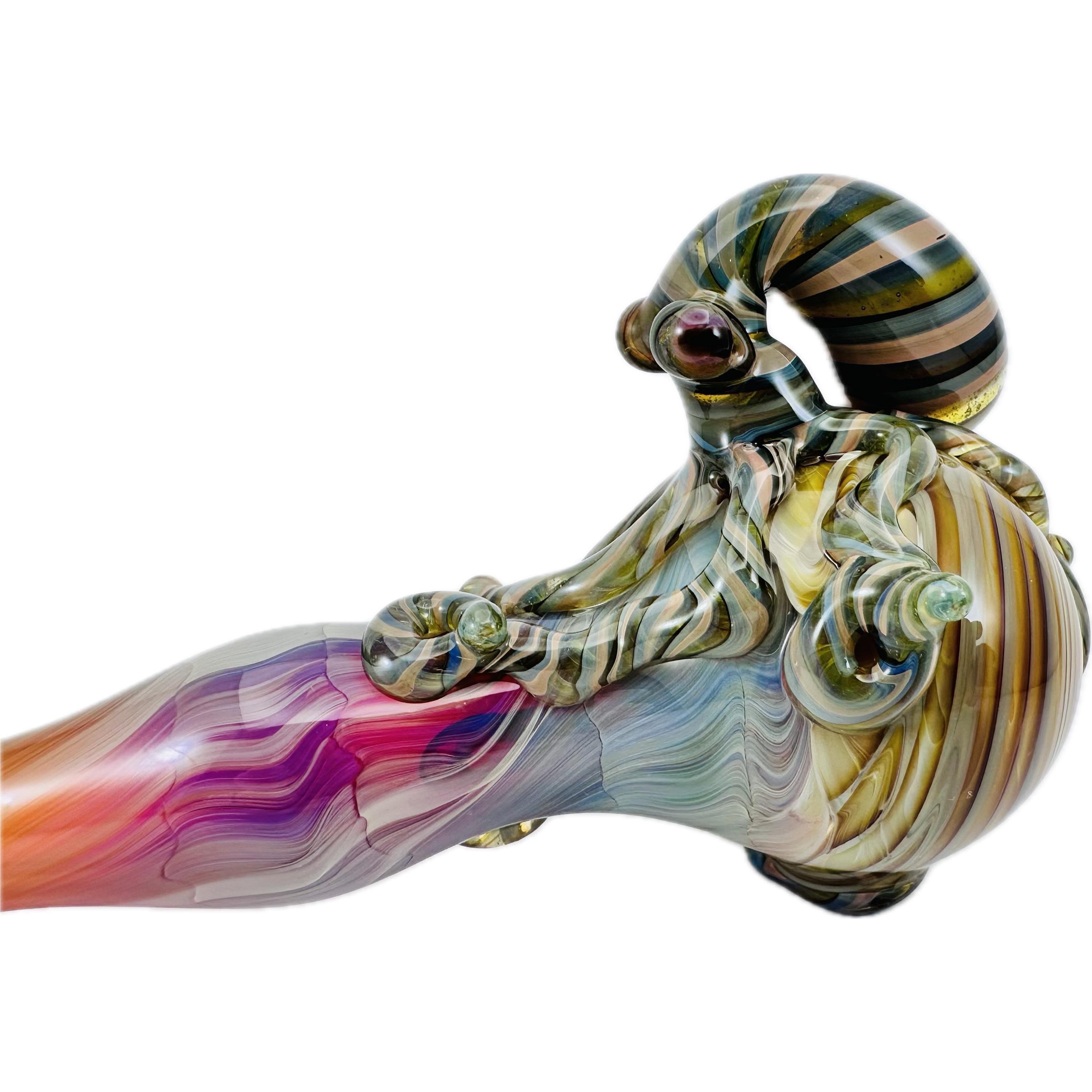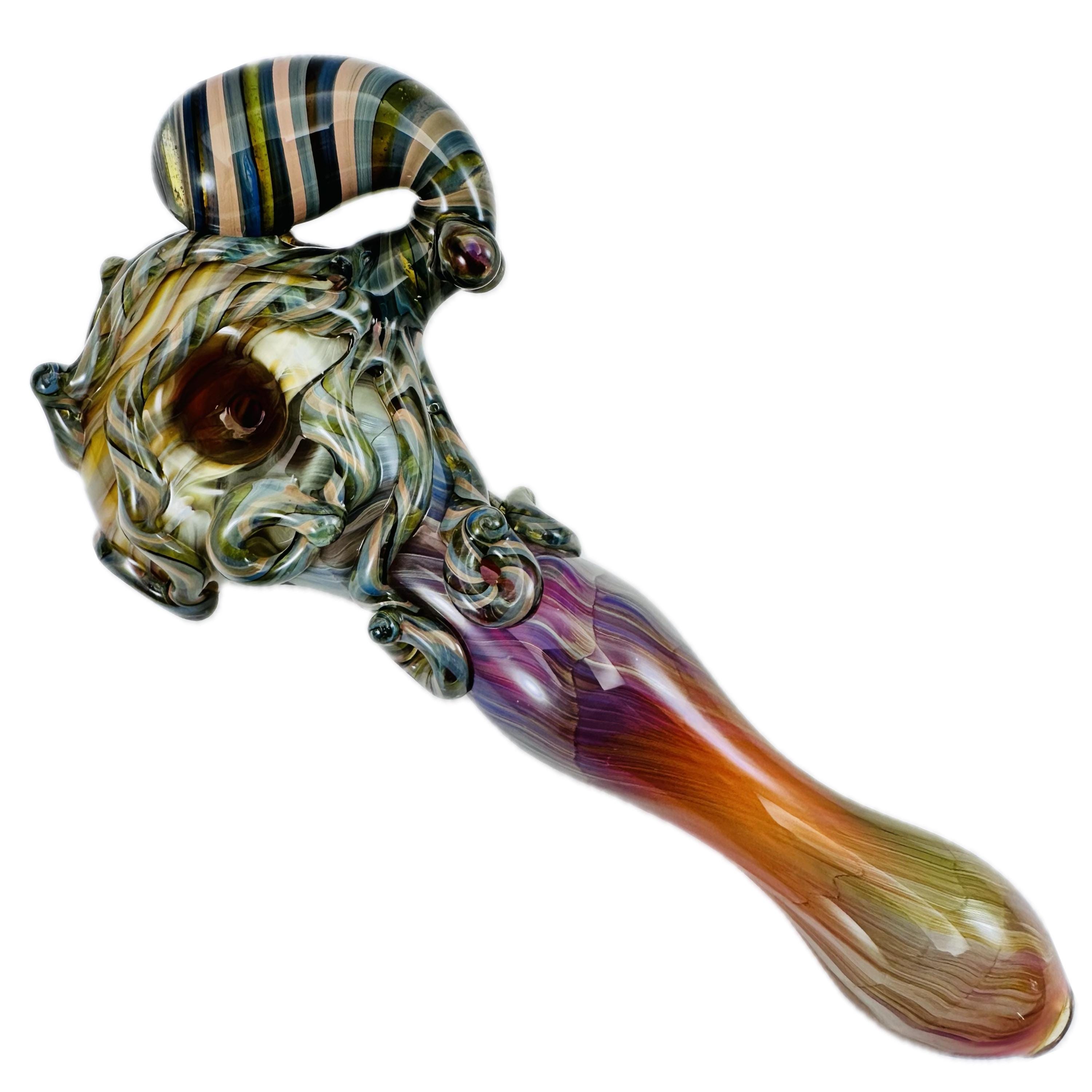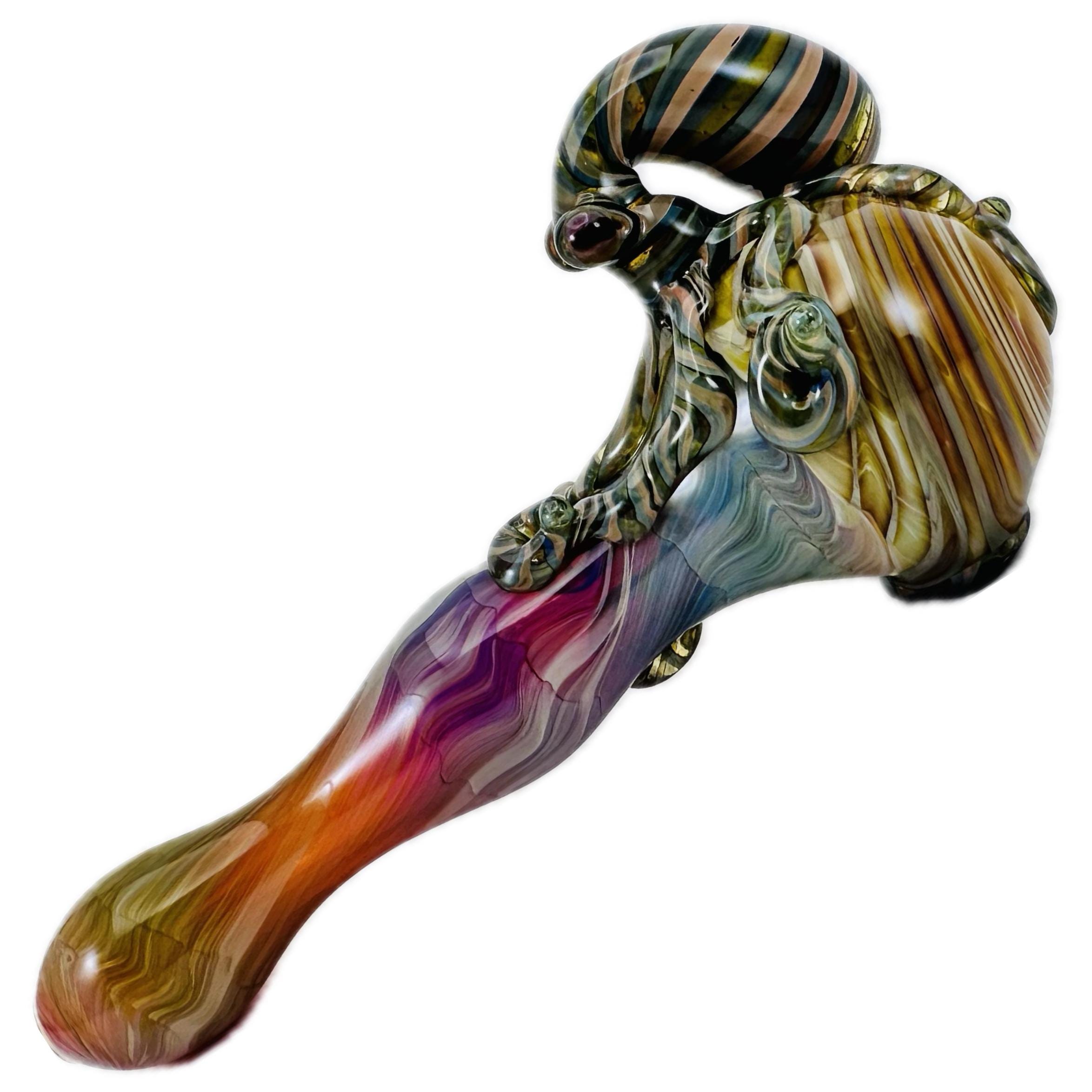 Beautifully hand-pulled multi-color Amber Purple glass spoon pipe detailed with an artistic flamework Octopus in artist choice hand pulled cane . Add-on realistic eyes.