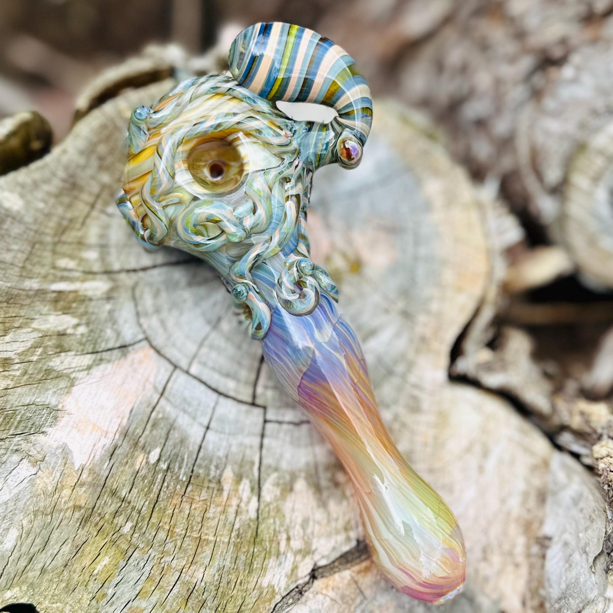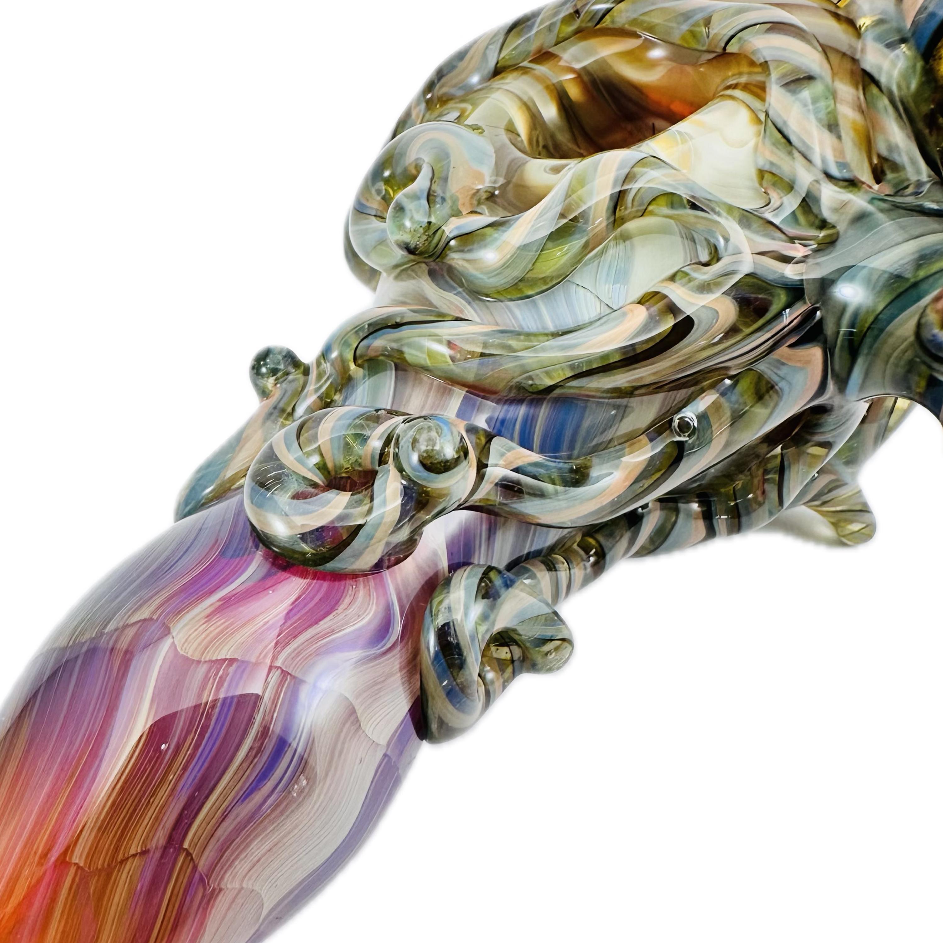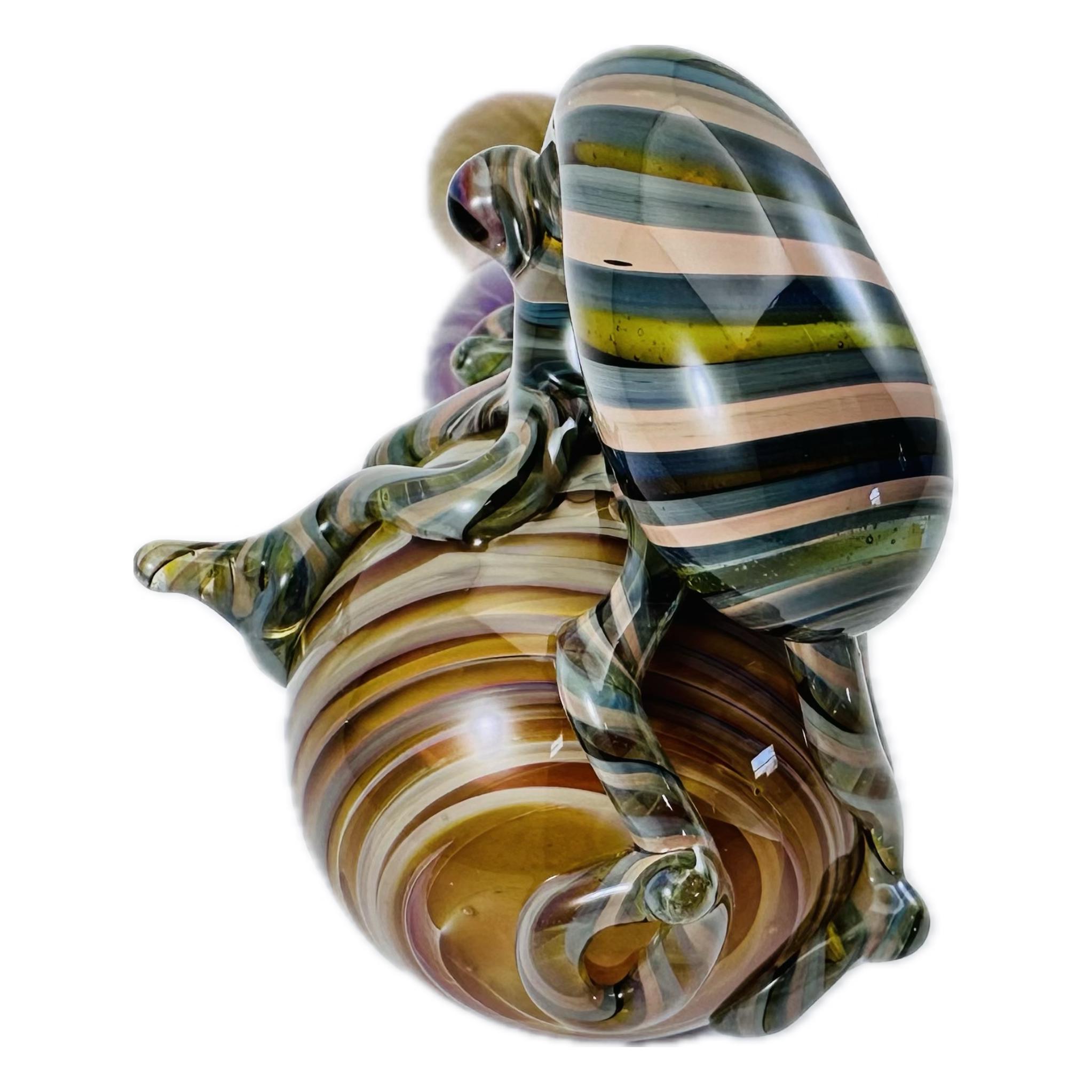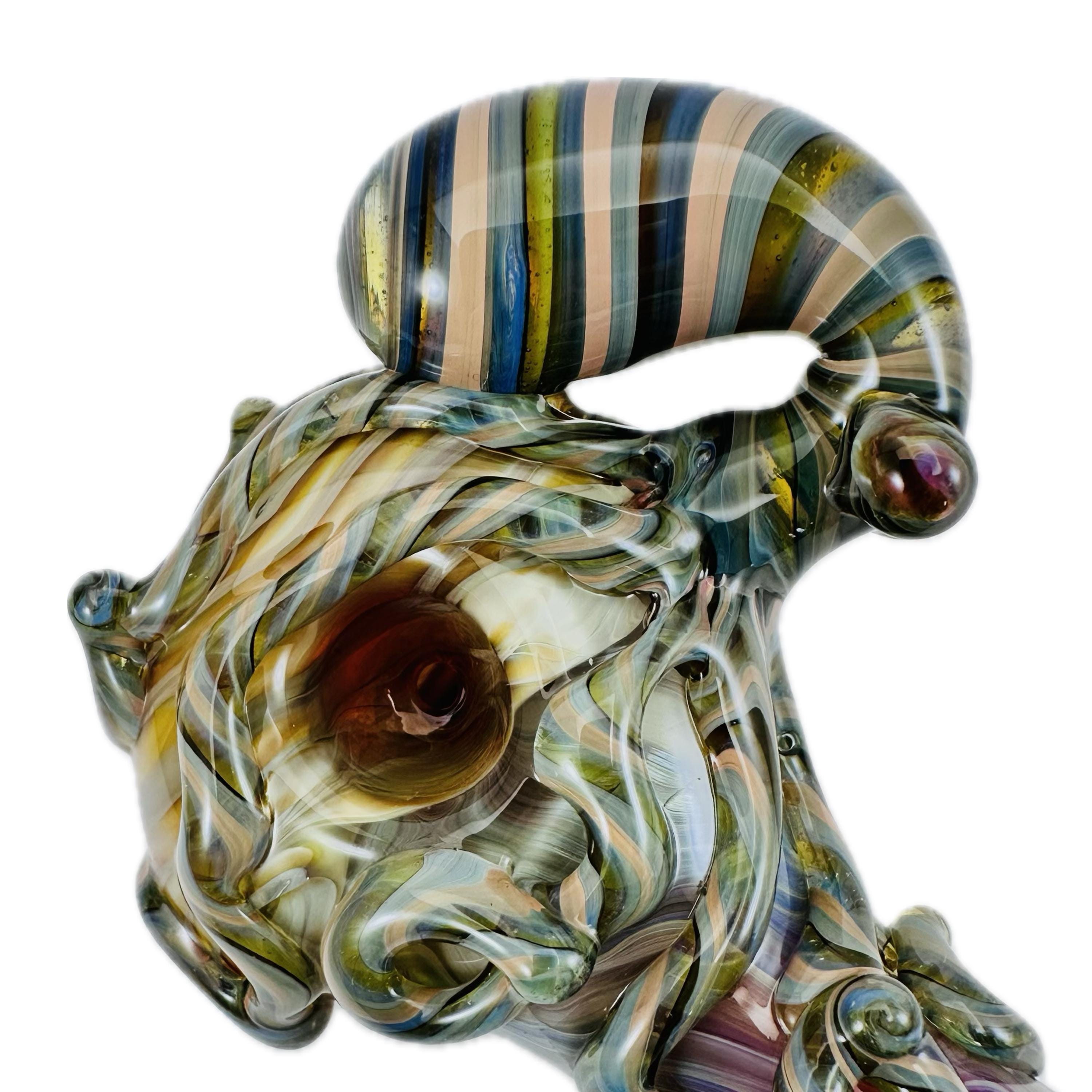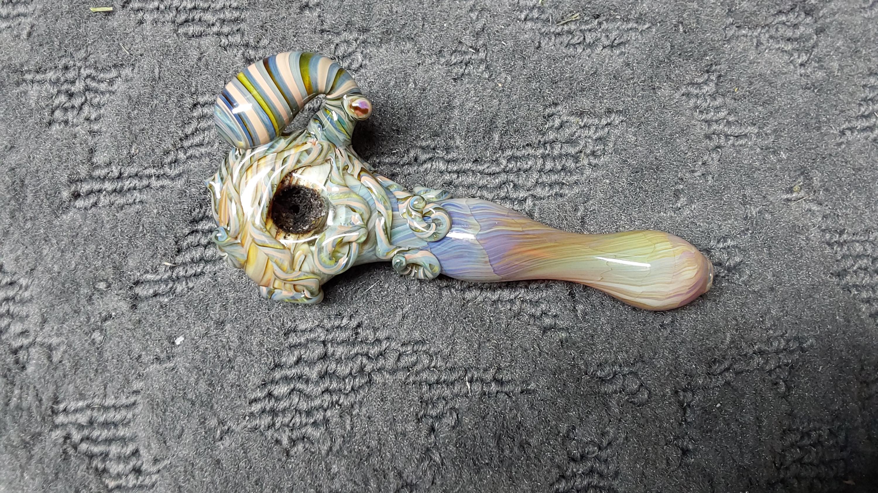 Beautifully hand-pulled multi-color Amber Purple glass spoon pipe detailed with an artistic flamework Octopus in artist choice hand pulled cane . Add-on realistic eyes.