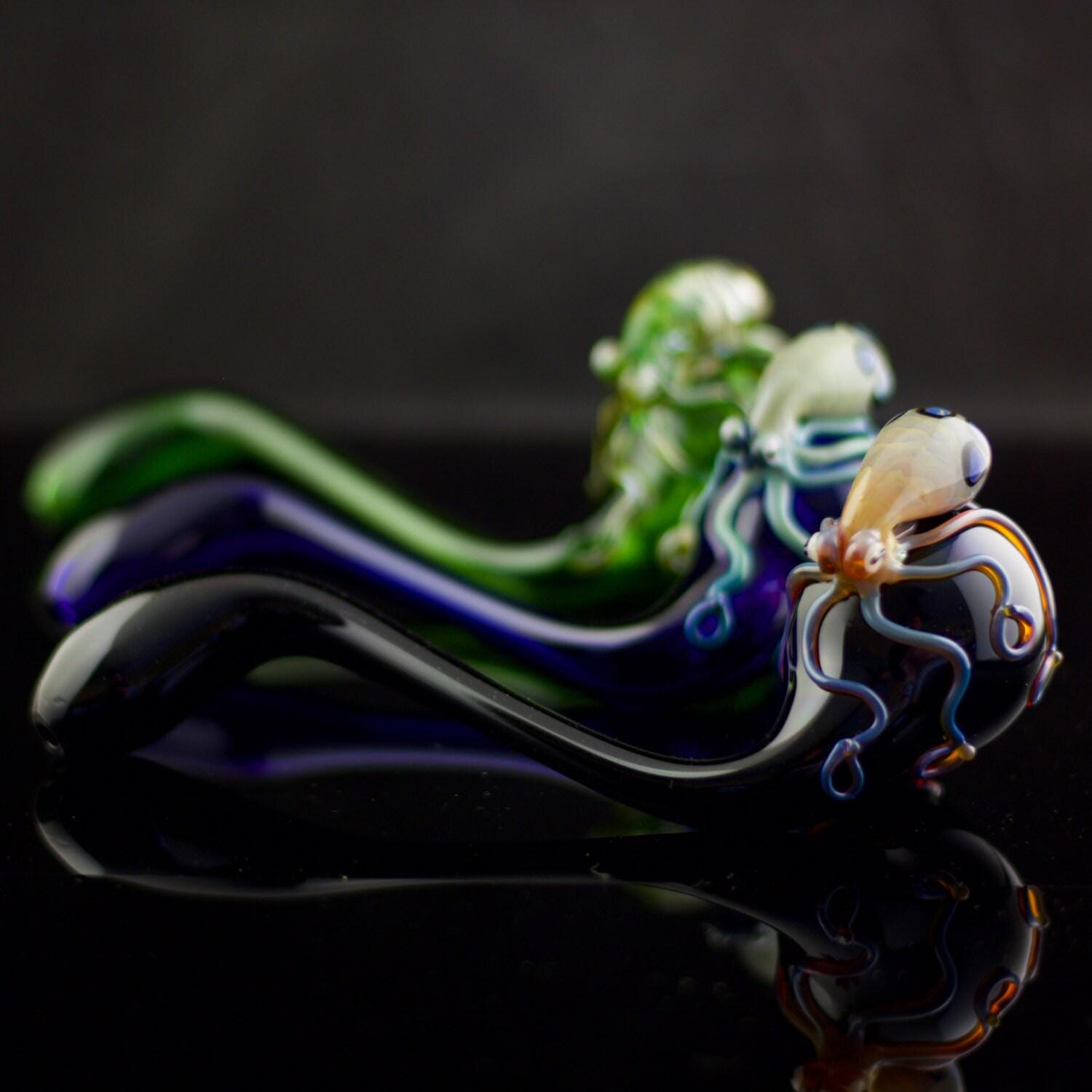 Discover more colorful customs and heady head shop pieces by visiting our Etsy shop. Elevate your smoking experience with this American made, ocean-themed hand blown Pyrex durable pipe designed for collectors and enthusiasts alike.