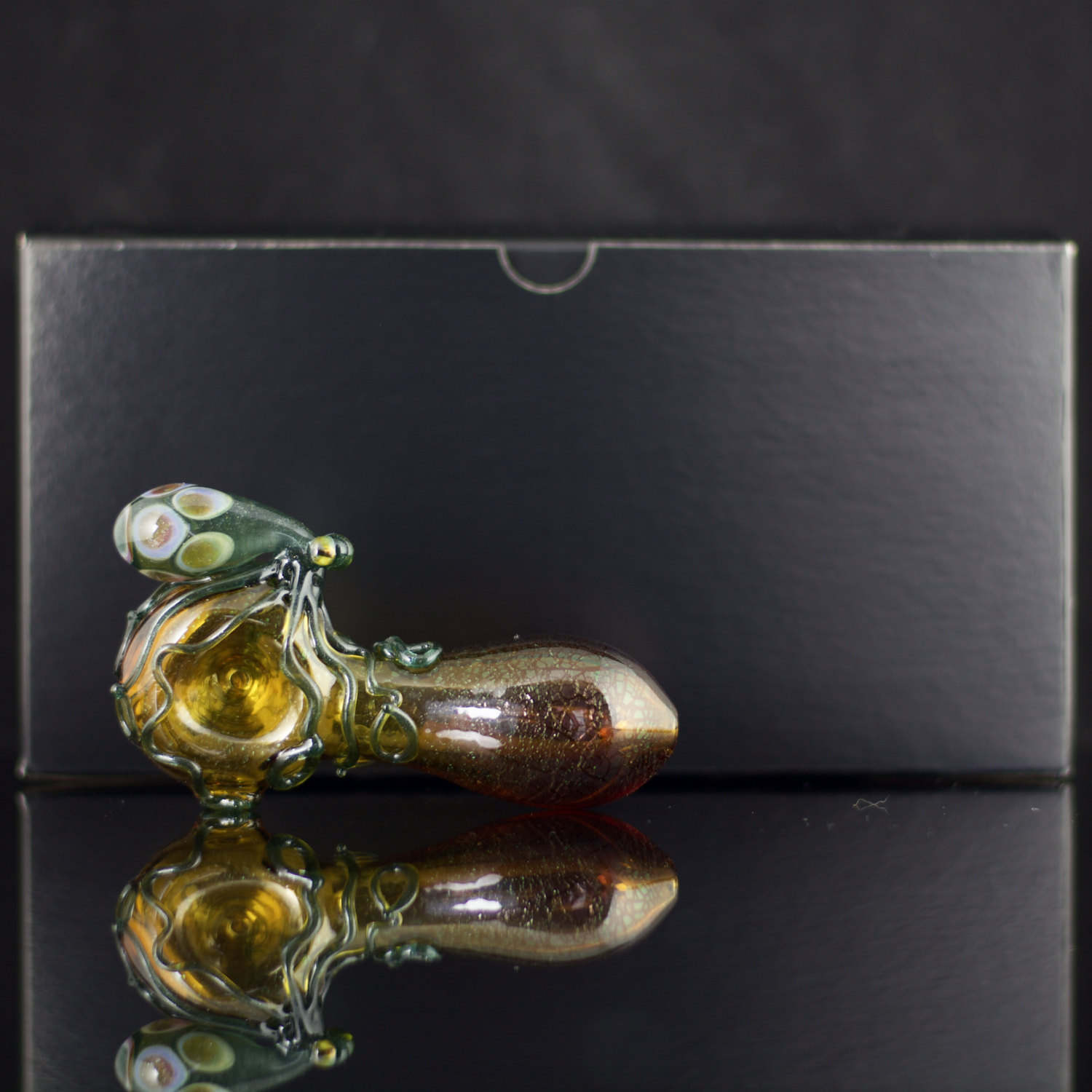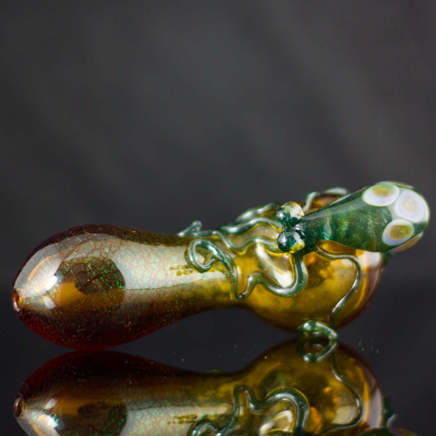 Exquisite glass spoon pipe in glittery Amber Boro Crow detailed with artistic flamework Octopus in sparkling Crystal Bliss. Add-on Amber Purple & Black realistic eyes and matching Crystal Bliss over Caramel double layer head dot upgrades.