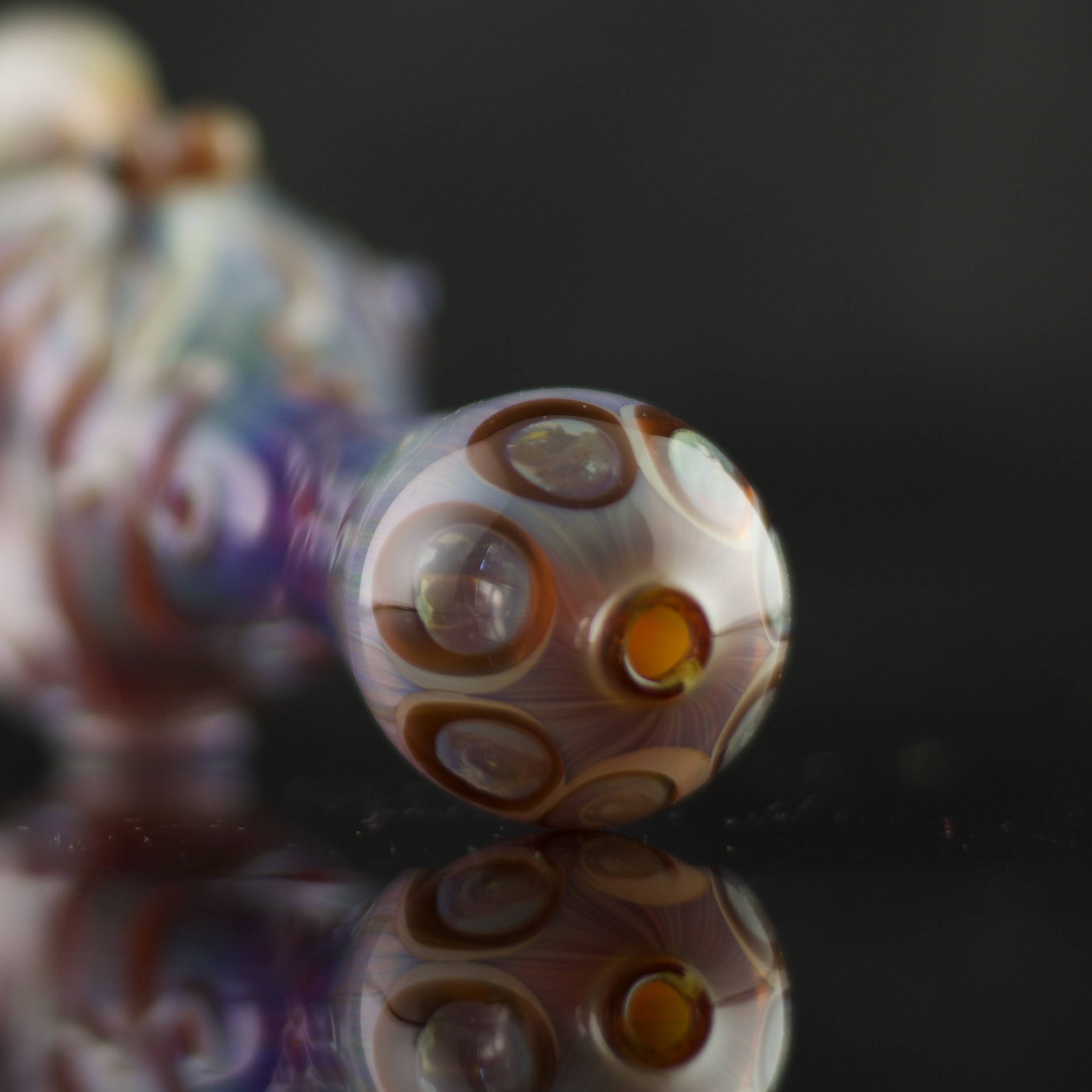 Exquisite glass spoon pipe in Amber Purple detailed with artistic flamework Octopus in Triple Passion. Add-on matching Amber and Black realistic eyes, double layer head dots and double dotted mouthpiece upgrades.